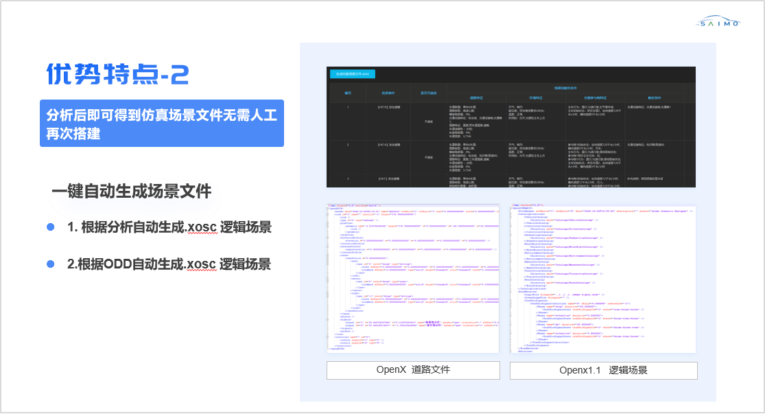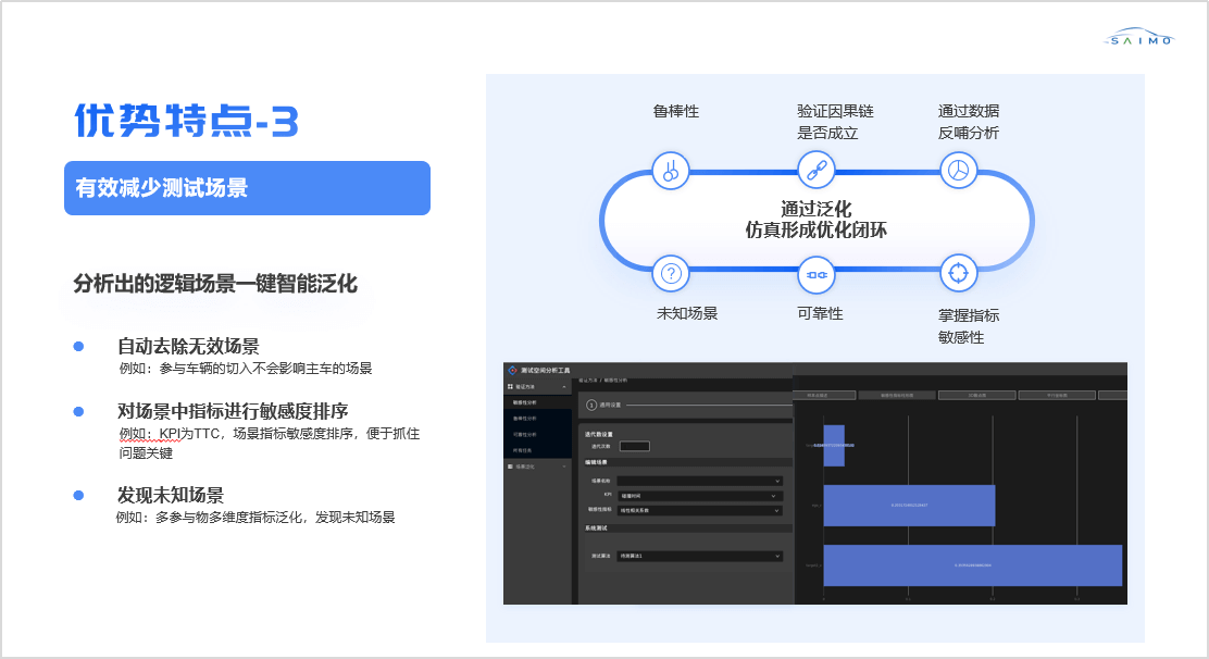 赛⽬深耕⾃动驾驶仿真测试领域多年,,技术⽔平处于国内⾏业领先地位,,⾃研算法驱动的Safety Pro预期功能分析⼯具和全栈仿真测试验证⼯具链具备四⼤优势特点,,,可完美实现预期功能安全的闭环实践: